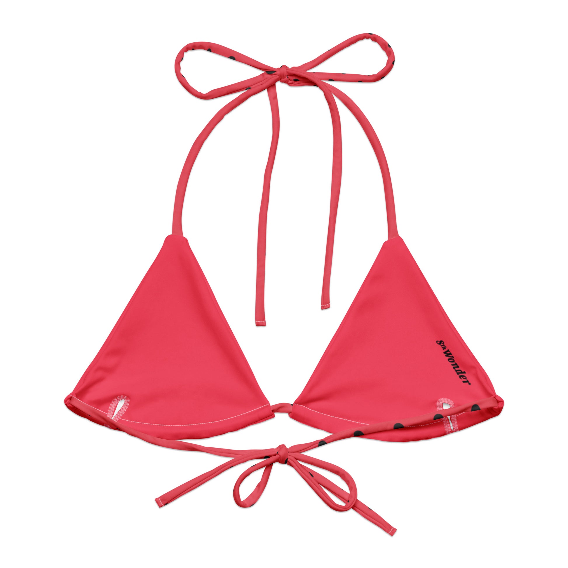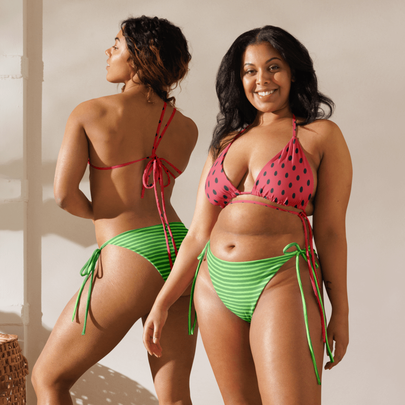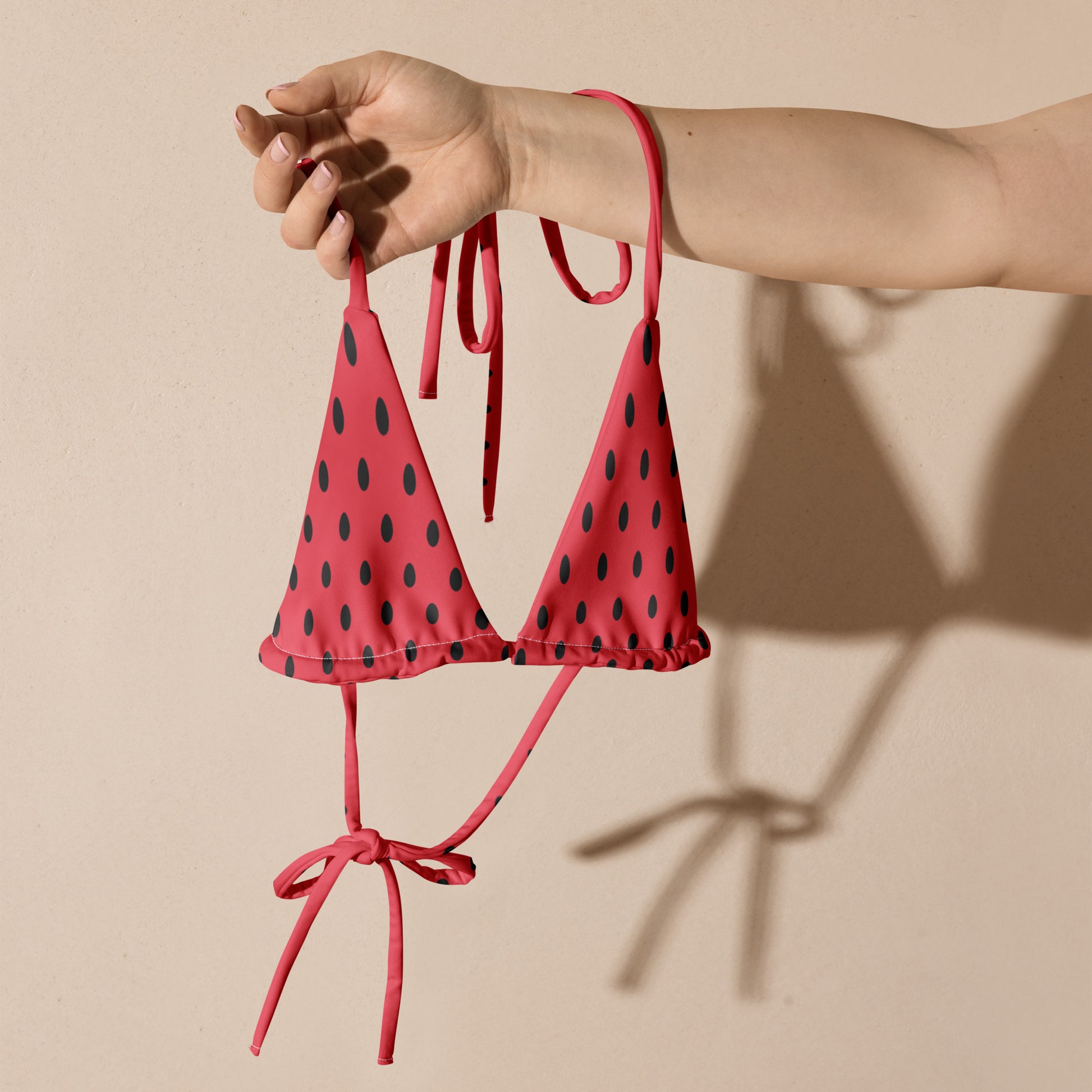 The sweetest little triangle two-piece with a faux watermelon polka dot pattern, pair with the coordinating watermelon rind bottoms